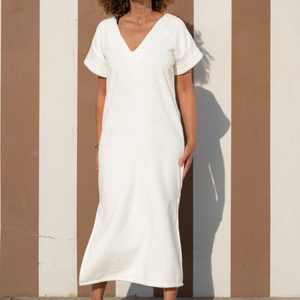 En éponge biologique, souples et douces, elles vous suivront partout cet été. Une paire de sandales, mon cabas Atelier Dune, et hop, prêt pour déambuler au marché, siroter un café avec une amie, ou filer à la plage ! Double col au choix, V profond devant ou au dos, ou arrondi bien dégagé, pour un résultat 2-robes-en-1 hyper malin. Notre robe Sixties en éponge velours sera même parfaite pour aller danser.